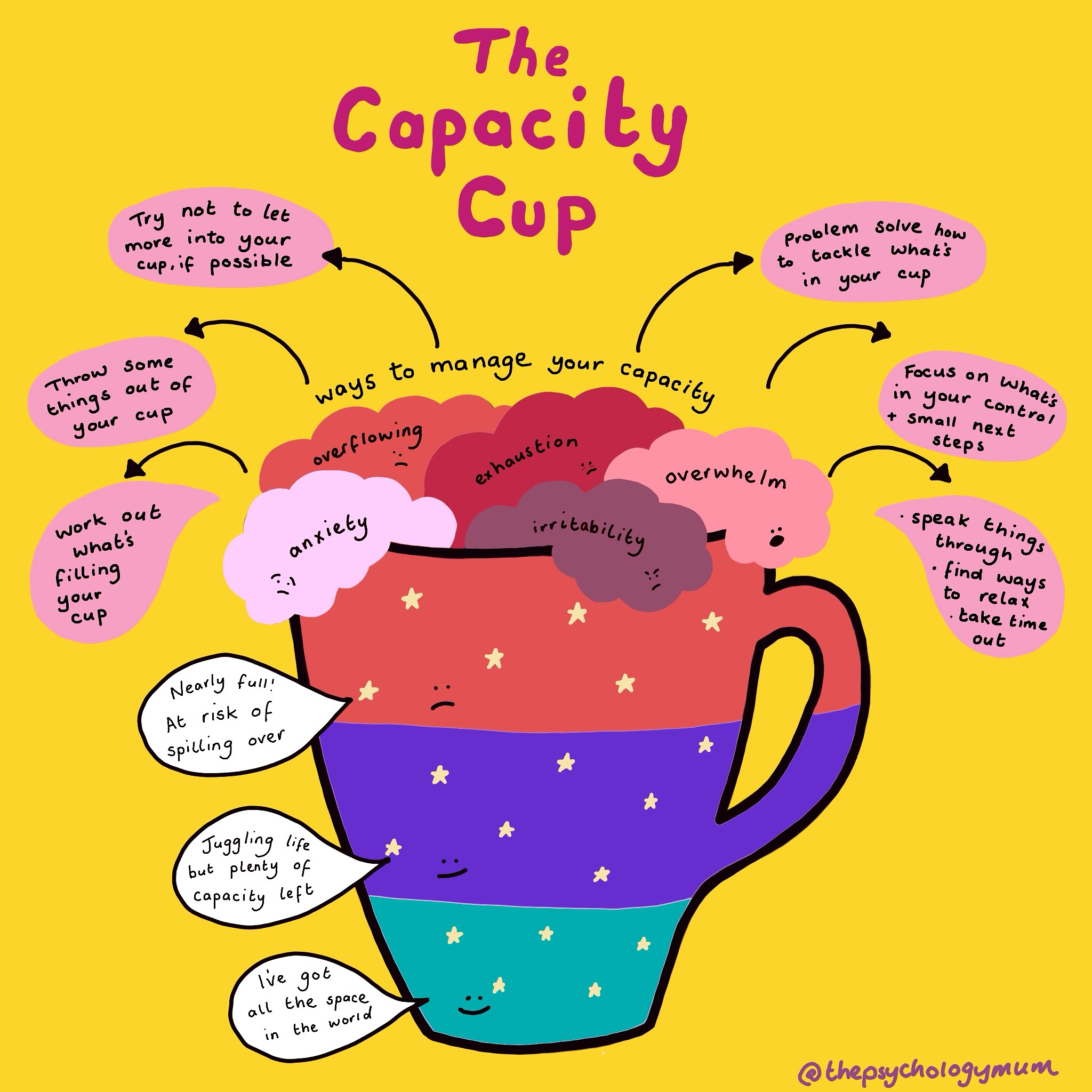 If you picture a mug, glass or cup, it has limited space inside and when it gets too full, it overflows. This cup represents your emotional capacity. We all, as humans, have a limited capacity, and everything you do - tasks, decisions, emotional labour, responsibilities - fills your cup.